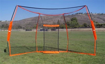 Turn any patch of grass into a baseball field with the Portable Multi-Sport Backstop. Coaches and players worldwide prefer this 17.6′ wide x 9.6′ tall backstop to protect their spectators and give outstanding reliability during practice or a game. The backstop has a large overhang to protect from foul balls and can be used as a catcher during soft-toss, tee work, infield practices, and more. Bownet’s EAS™ technology (Energy Absorption System™) helps reduce stress and tension on the netting, extend the lifespan of the net, create a more balanced backstop, and add flexibility and stability upon impact. Powder coated steel frame have non-marking rubber feet to prevent damage to floors and provide stability and traction indoor and outdoor. The Backstop sets up in 3 minutes without pull straps, screws, or tools required and is lightweight making it easily maneuverable across a field or gym. The Bownet Portable Backstop includes a Baffle Net and a Canvas Baffle with a printed strike-zone to turn this backstop into an all-in-one practice net that you can hit or throw into or out of. Collapse the backstop and place into the provided manageable roller case for easy portability and storage. One year limited manufacturer warranty available. PLAY ANYWHERE. – PLAY NOW!®