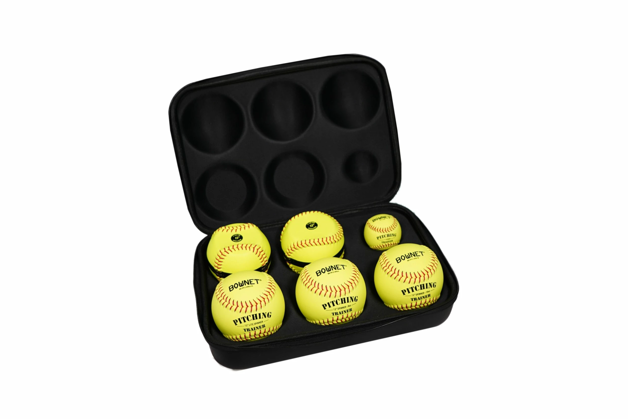 Train like a Pro with the six-ball Ultimate Pitchers Training Kit from Bownet Sports. Designed for serious softball players, this kit contains everything you need to improve your pitch and step up your game. The kit includes three spinner trainer softballs along with three strength and velocity softballs, all packaged neatly in a molded kit case for storage, travel and organization.