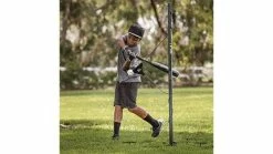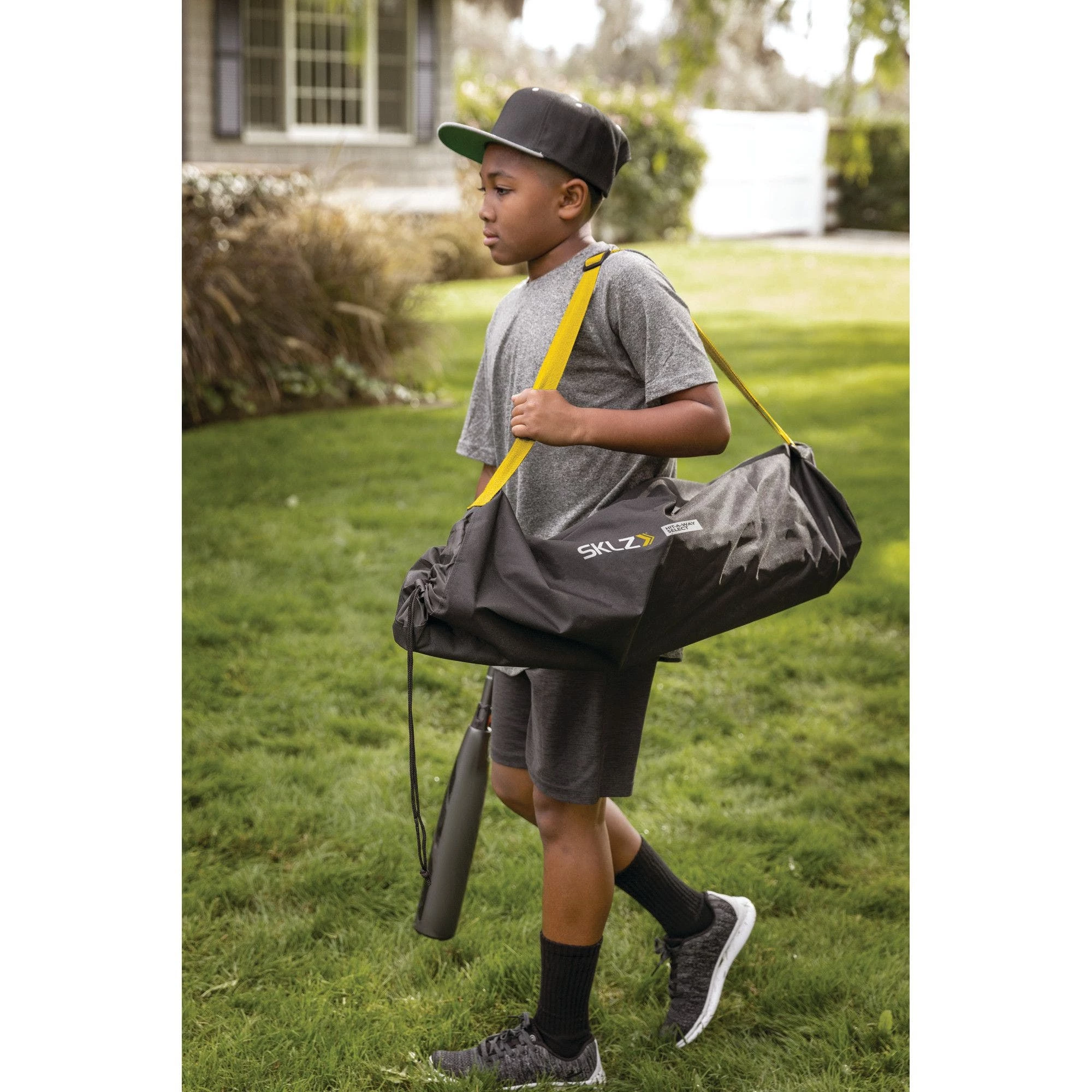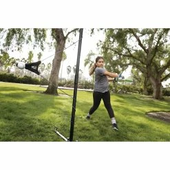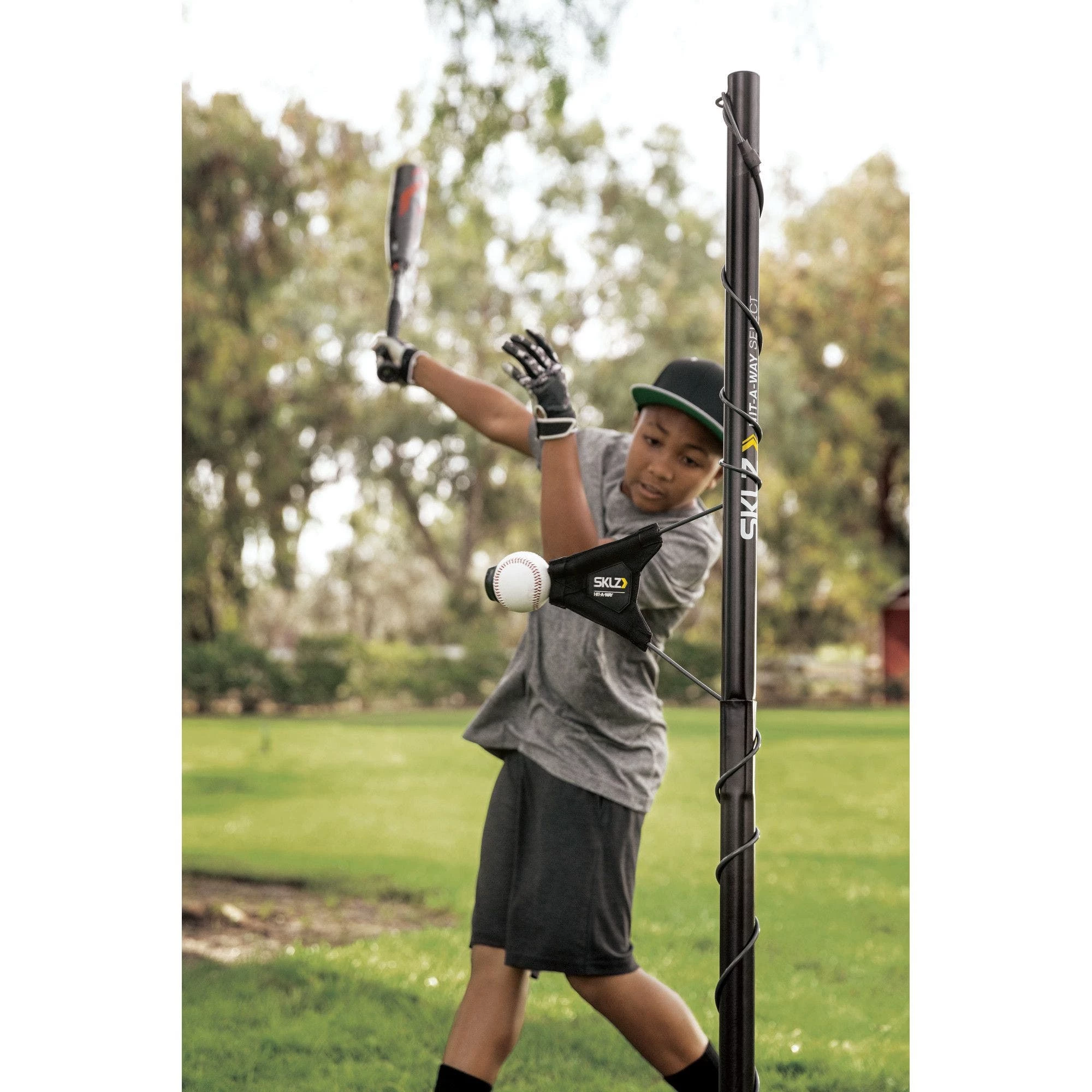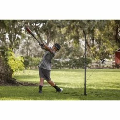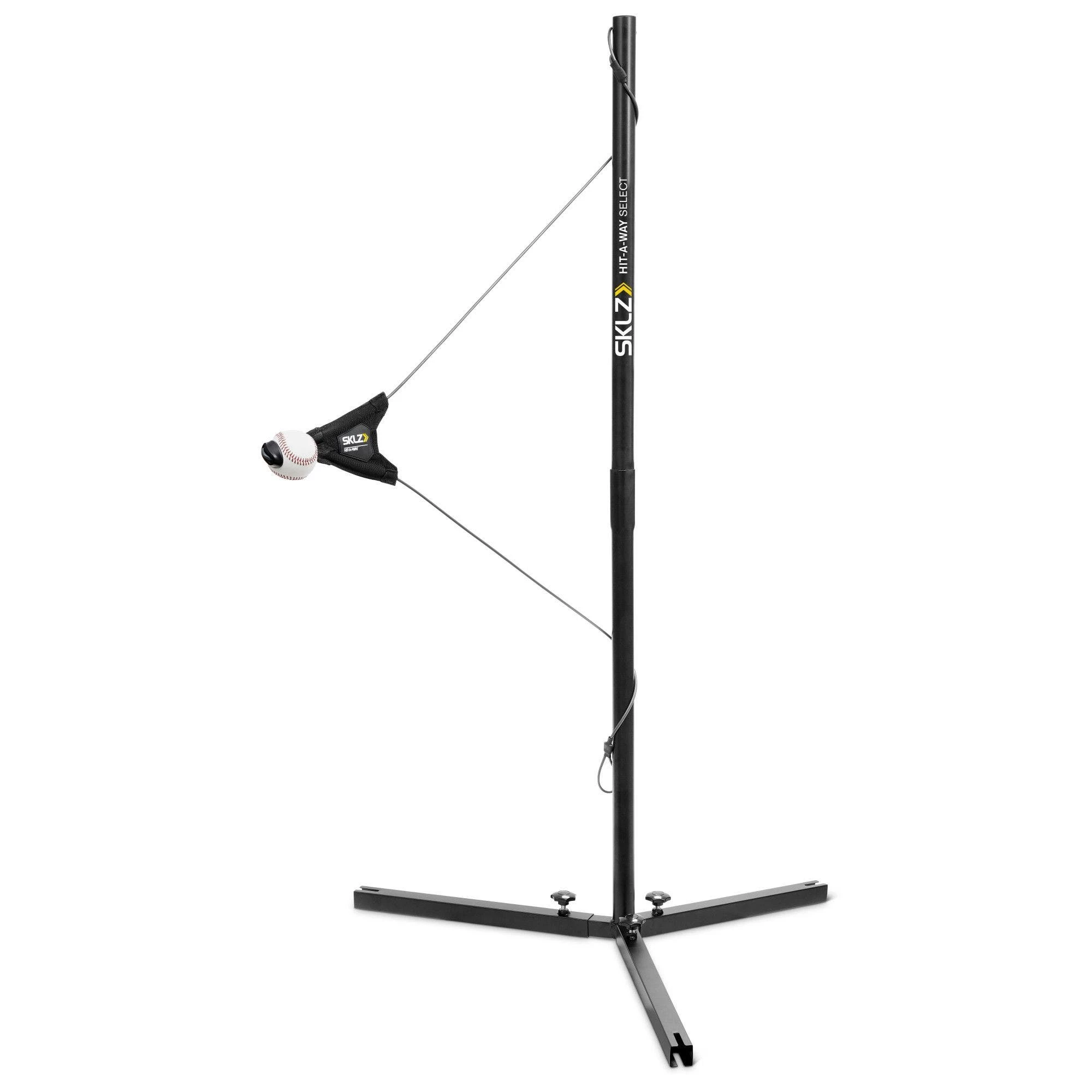 The Hit-A-Way Select is a dynamic swing trainer that helps improve batter�s timing, contact, and confidence at the plate, and is perfect for team or solo practice. By utilizing the twist-back ball and cable design, athletes can simulate real pitches during practice or at home training. The unique customizable design allows for athletes to easily adjust the cable and ball position for different pitch locations. The trainer can be used by both right or left-handed batters to improve swing timing and stride length to help create a smoother swing. For maximum repetition, athletes keep the ball in motion by hitting the ball as it returns around the center pole. Built to withstand hours of practice, it�s tough enough to hold up against seasons of use. The Hit-A-Way Select features a two-piece durable center pole with removable legs for easy breakdown, storage, and transportation. It also comes with a carry bag and three large metal spikes for anchoring. Recommended for ages 13 and under.