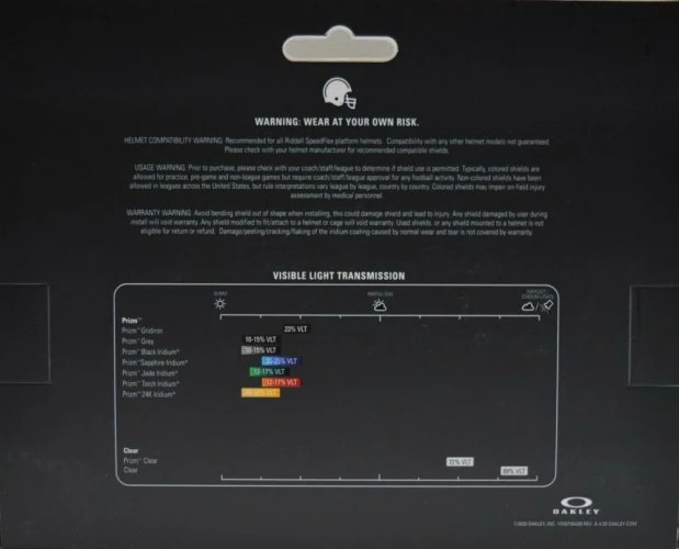 Oakley® uses injection molding to shape the shield with unique curvature. The contours are designed with CAD/CAM engineering to maintain clarity at all angles of vision, even at the sides, so peripheral view is optimized. PLUTONITE shield material inherently blocks 100% of all UVA, UVB, UVC and harmful blue light up to 400nm. That means even clear Oakley® shields filter out all the bad rays. All Oakley® football shields are manufactured with AFR lens treatment, which translates to anti-fog performance and improved scratch resistance. Optional lens tints allow the player to precisely tune light transmission for game conditions, offering yet another competitive advantage with Oakley® technology.