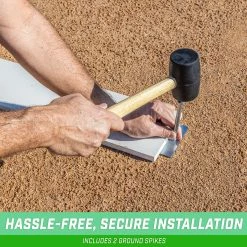 - FIELD OR HOME USE: Set up in seconds on dirt mounds at the field or on your backyard lawn; Includes 2 stainless steel ground spikes to stabilize the rubber and keep it in place throw after throw