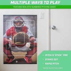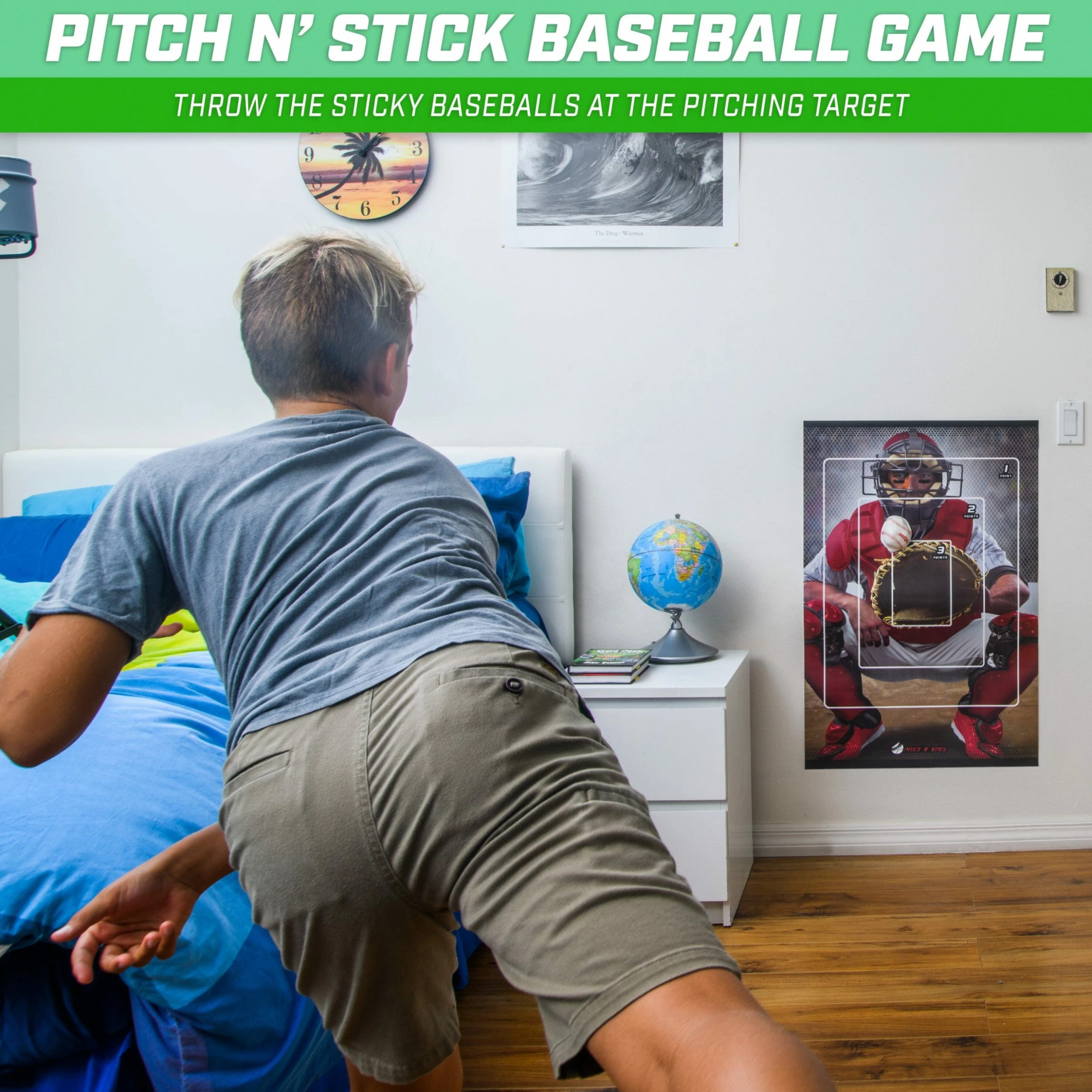 - PITCH N STICK: Players compete to throw the sticky baseballs at the target to score points. The balls stick to the target so you can easily tell where the balls score in the strike zone. Stick the poster to a wall or door for endless indoor fun.