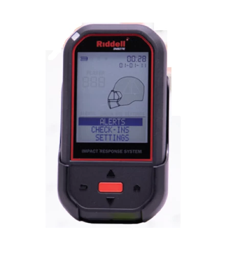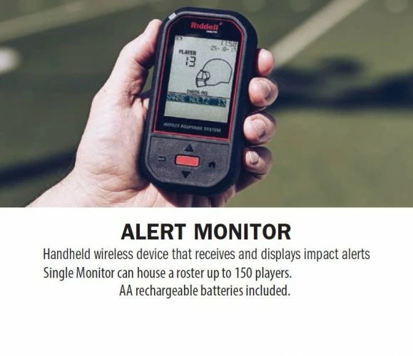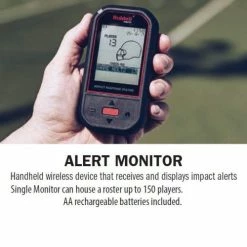 - handheld device that receives alerts from the player unit, signaling to sideline staff with a blinking light, vibration and/or audio signal that head impact(s) have occurred that exceed impact thresholds.